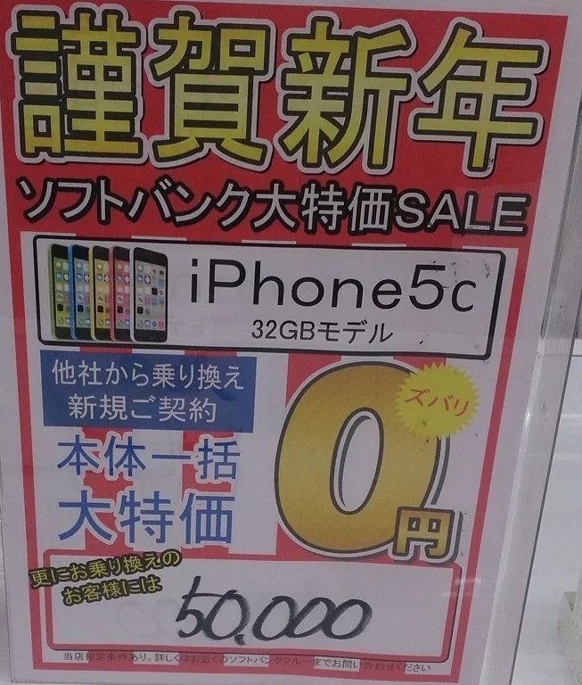 ソフトバンク iPhone5c 32GB MNP一括0円+CB50,000円