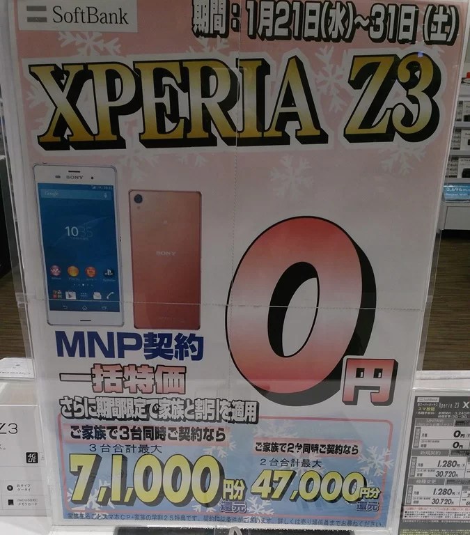 またソフトバンクはXperia Z3のキャッシュバック額を先週よりも大幅に値上げしてきました。
