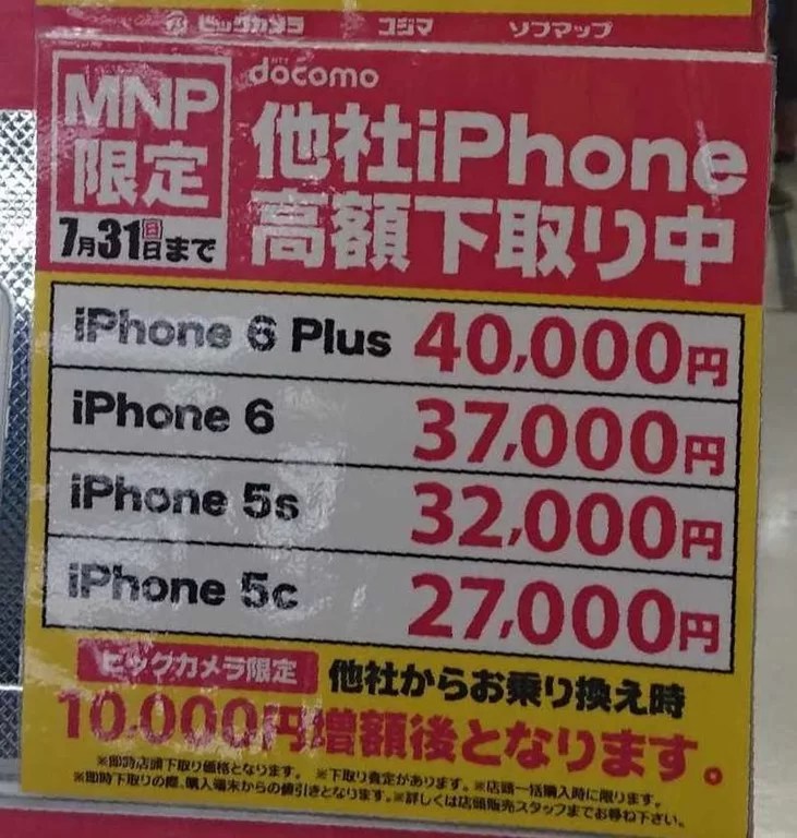 ドコモ 量販店での下取り増額継続2016年7月23日ドコモは下取り価格を通常より10,000円増額するキャンペーンを継続していました。ただし先週まではiPhone5も対象でしたが、今回ポップから削除されています。 docomo,ビックカメラ,量販店docomo,ビックカメラ,量販店Posted by mobilego