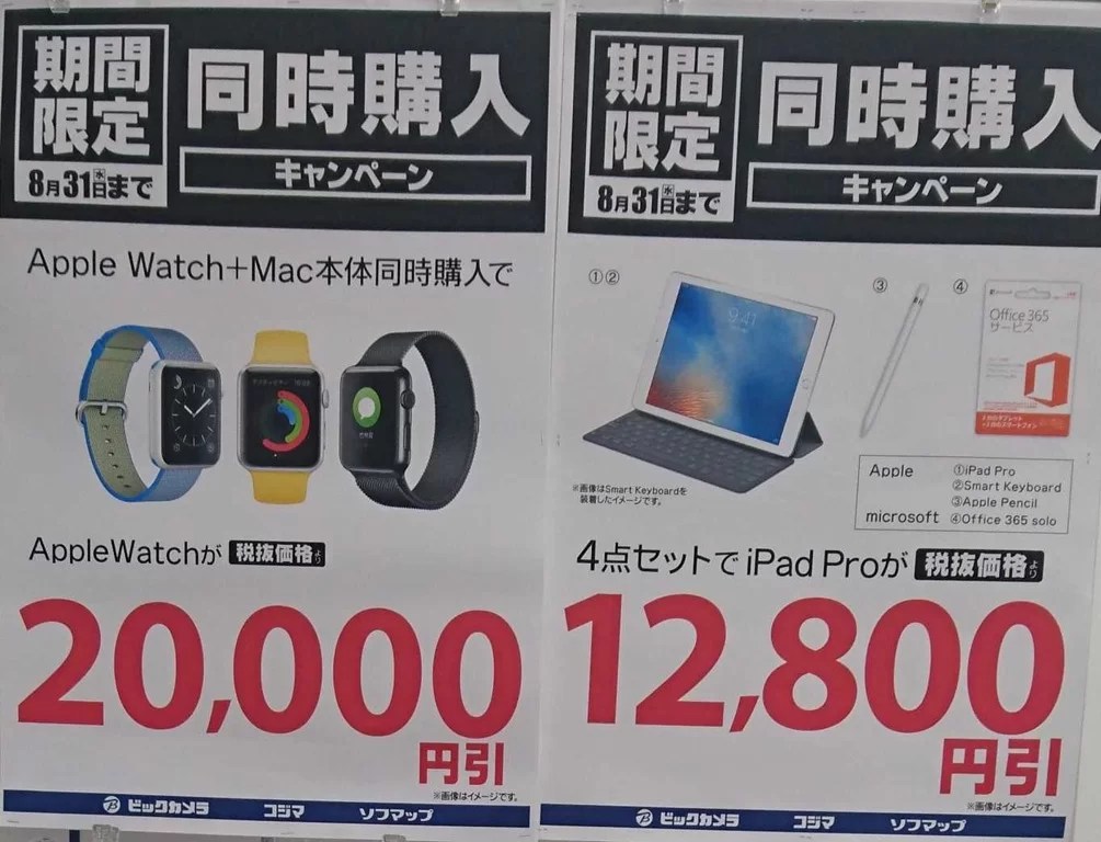 ビックカメラ 同時購入キャンペーンでiPad Pro等を値引2016年8月13日お盆休みということで、量販店も色々な手を駆使して製品を売ろうとします。ビックカメラ池袋店では在庫処分でMacBookを、セット販売でApple WatchとiPad Proを売ろうとしているようです。果たして不要なものまで購入して、値引して貰う価値があるのか不明ですが・・・。 apple,ビックカメラapple,ビックカメラPosted by mobilego