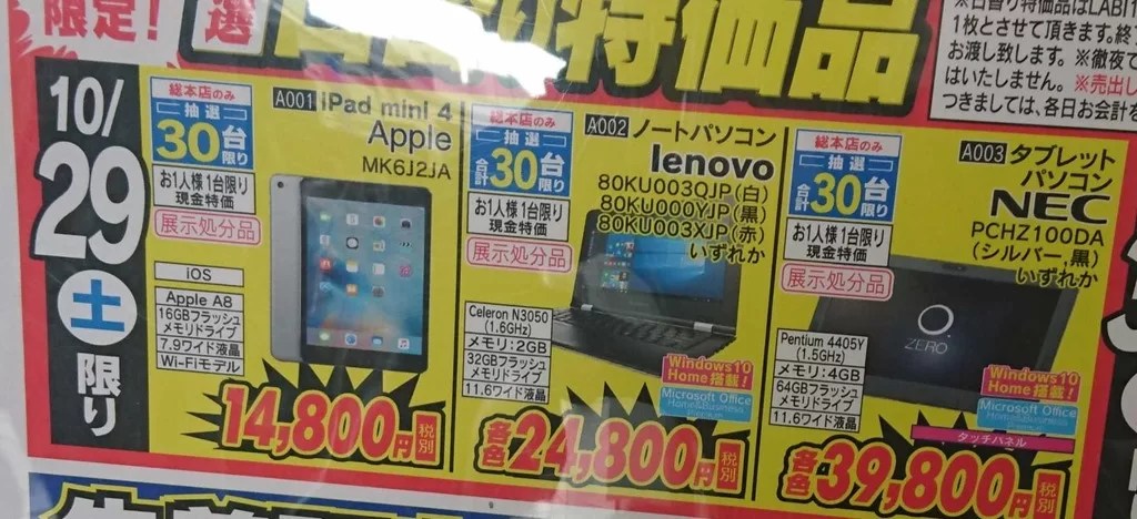 流石に特価ということで、iPad mini 4が14,800円、64GBも19,800円です。