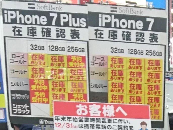 2016年12月第5週目 量販店iPhone7とiPhone7 Plusの状況2016年12月31日いよいよ今年も今日で終わりです。大晦日ということで、お客さんもそれほど多くない状況ですが量販店では相変わらず淡々とiPhone7の販売が続いています。量販店の在庫状況は年末ということでほぼ問題ない状況です。ジェットブラックも在庫がある状況でした。 なおヤマダ電気のソフトバンクでは実質負担0円で販売していました。年末ということで、勝負に出たのでしょう。ただ下取りがiPhone6sというのが・・・。 iPhone7,iPhone7Plus,量販店iPhone7,iPhone7Plus,量販店Posted by mobilego