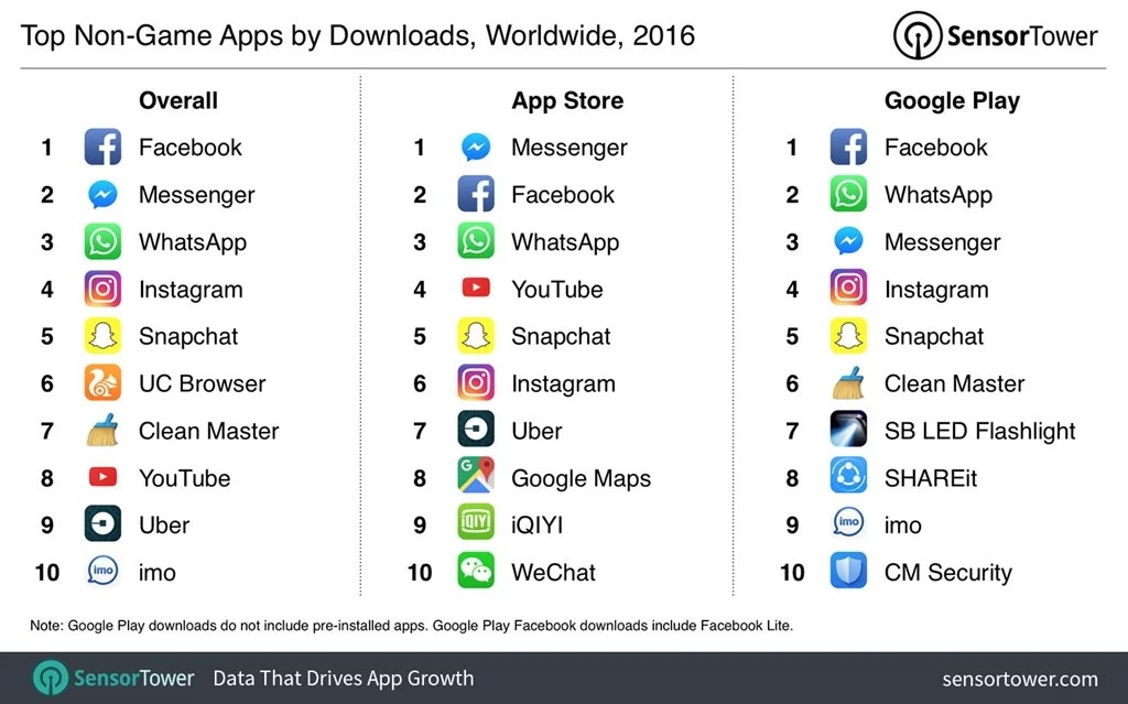 2016年のゲーム以外のアプリのダウンロード数は、アップルではMessenger、GoogleではFacebookでした。