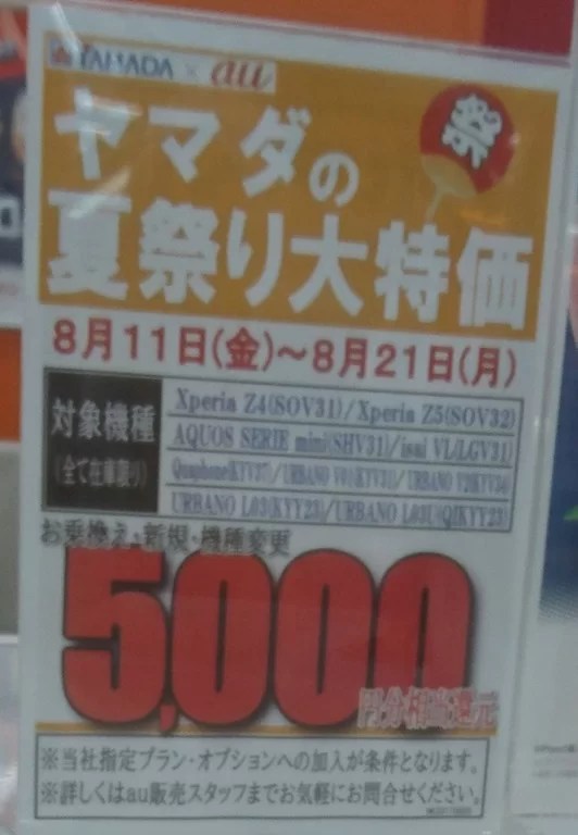 2017年8月第2週目 ヤマダ電機キャンペーンの状況2017年8月12日お盆休み+3連休ですが、量販店は特にこの期間に特化したキャンペーンは1つだけ実施されていました。、ただ8月のキャンペーンとして少しだけ実施していました。auですが、お盆期間だけ旧機種のみ5,000円のCBを実施しています。また家族でおトクで10,000円のCBも実施しています。お盆休みにしては寂しい状態ですが、少しだけでもキャンペーンがあるのだけマシでしょう。 キャンペーン,量販店キャンペーン,量販店Posted by mobilego