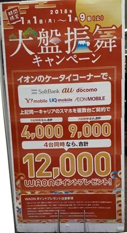 2018年1月第1週イオンニューコムの状況2018年1月7日2018年最初の週末ということで、イオンモバイルも様々なキャンペーンを実施していました。特に複数台でWaonプレゼントキャンペーンを全キャリアで実施していました。イオンモバイル独自キャンペーンと思いますますが、珍しいことです。またauも複数台でのCBを実施していました。最近auはCBの頻度が増えているようです。 Androidについても実施していましたが、こちらはあまりお得とは言えません。 イオン,イオンモバイルイオン,イオンモバイルPosted by mobilego