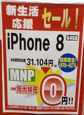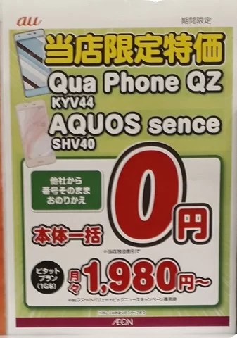2018年4月第2週イオンニューコムの状況2018年4月15日イオンニューコムも店頭ではキャンペーンが少し減ってきました。 が、各キャリアは別の場所でそれぞれ大規模なイベントを開催していました。ドコモはiPhone8の相変わらず一括0円で販売しています。 他のキャリアは同様のポップを見かけなくなりました。 一方、auはAndroidの機種で色々キャンペーンを実施しています。 Quaシリーズや多くのAndroidシリーズを一括0円で販売しています。 また学割プランでは、10,000waonポイントがもらえるキャンペーンも実施しています。 イオン,イオンモバイルイオン,イオンモバイルPosted by mobilego