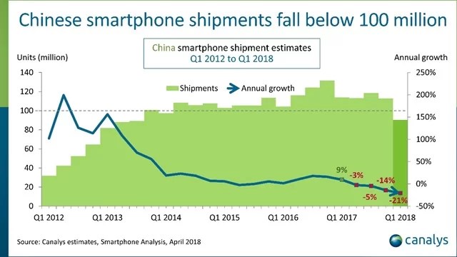 2017年Q1と2018年Q1の中国でのシェアを見ると、トップ4のシェアがさらに増加しています。