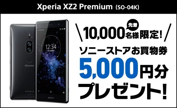 2018年8月31日まで、ドコモオンラインショップでXperia XZ2 Premiumを購入したユーザーを対象に、先着10,000名にソニーストアで使用できる5,000円分の買い物券をプレゼントします。