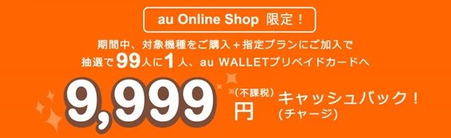auはオンラインショップで対象機種を購入した場合に、99人に1人の割合でWALLETプリペイドカードに9,999円キャッシュバックするキャンペーンを開始しました。