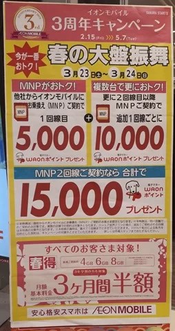 2019年3月第4週イオンニューコムの状況2019年3月24日3月も4週目に入りました。 学生も春休みに入り、店舗も少し混雑しています。 イオンニューコムも週末限定でキャンペーンを実施していました。 ドコモはiPhoneXSを端末購入サポート適用したために、早速ポップを出していました。 流石にiphoneXSが19,800円だと、iPhoneXRとどちらを検討するか考えるユーザーも出てくるかもしれません。 イオン,イオンモバイルイオン,イオンモバイルPosted by mobilego