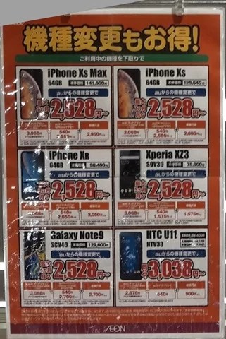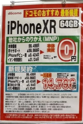2019年4月第2週イオンニューコムの状況2019年4月14日4月も2週目に入りましたが、少しだけ変化がありました。 auは機種変更向けのポップを新たに出してきました。 iPhone7などのポップは先週と同じものが出ていました。 一方ドコモはまだiPhoneXRのポップを出しています。 docomo withも先週に引き続きMNPでは一括0円で販売していました。 昨年は機種変更でも一括0円で販売していたのですが、今年はどうでしょうか? イオン,イオンモバイルイオン,イオンモバイルPosted by mobilego