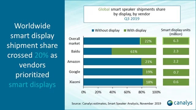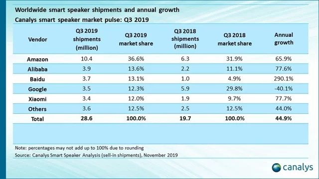 調査会社のCanalysが、2019年Q3のスマートスピーカ市場の調査結果を発表しました。