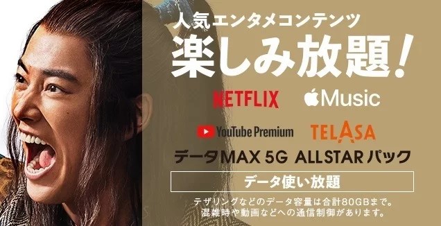 このプランは、データ通信が使い放題でNetflix、YouTube Premium、TELASA、Apple Musicがセットで5,460円/月で利用できます。