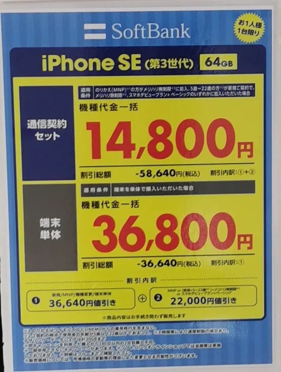 ソフトバンク 第3世代iPhoneSE 64GBを一括14,800円で販売2023年2月12日 ソフトバンクは第3世代iPhoneSE 64GBを一括14,800円で販売しています。この価格は年末の販売価格と変わっておらず、まだ年度末の価格設定にはなっていないようです。 softbankiPhoneSE3,softbankPosted by mobilego